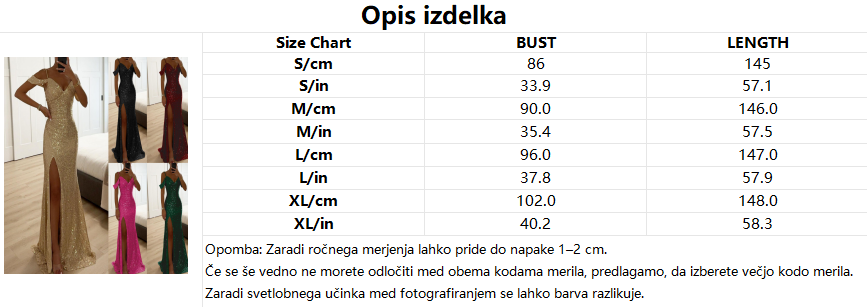 Bleščeča obleka z visokimi razporki in golimi rameni